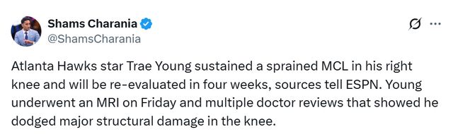 北京时间11月2日,据名记Shams报道,消息人士向ESPN透露,亚特兰大老鹰队球星特雷-杨右膝内侧副韧带扭伤,四周后将接受复查。杨已于昨日完成核磁共振检查,经多位医生会诊确认,其膝盖未出现重大结构性损伤。